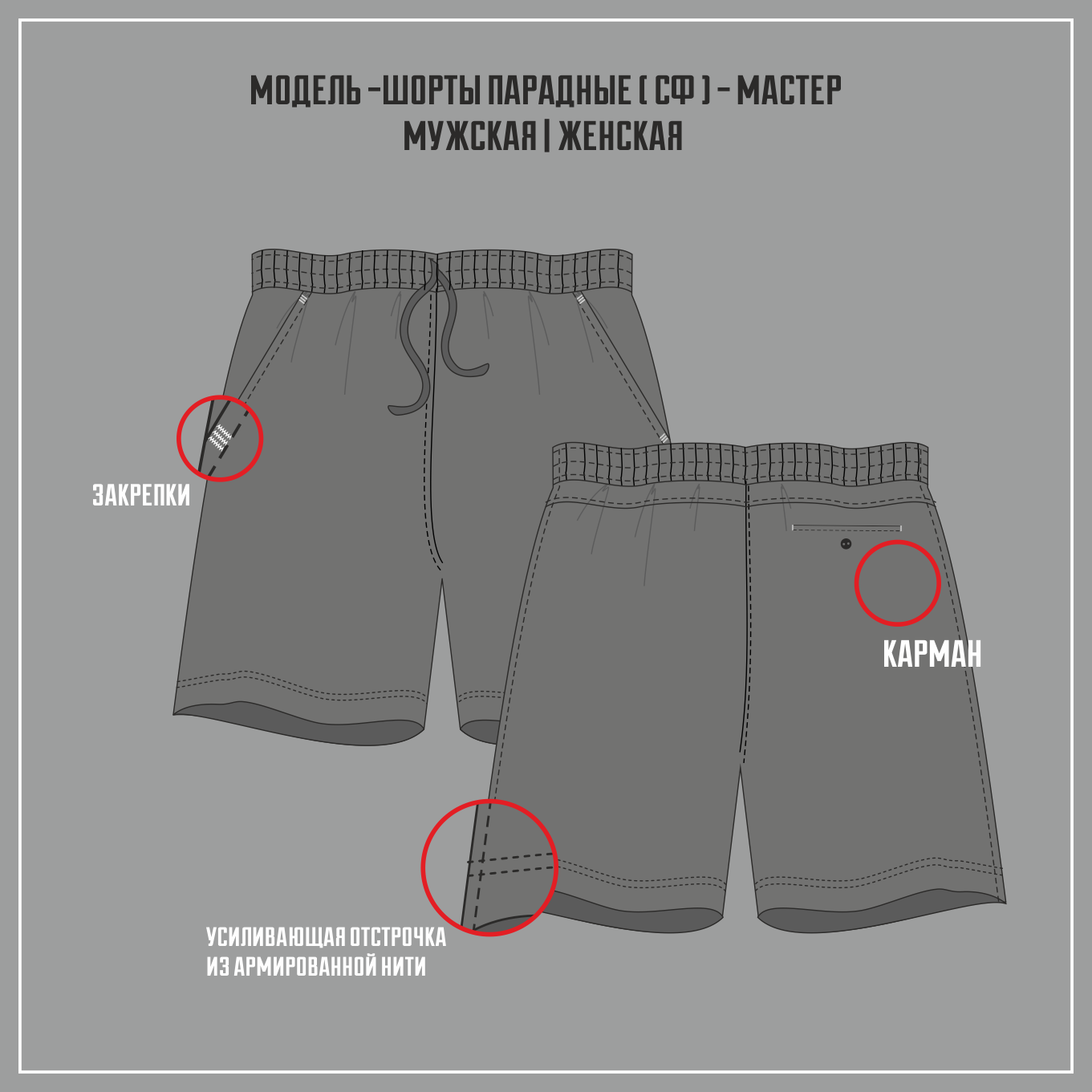 Классические шорты. Прямые, среднего объема, выше колена. Верх обработан широкой резинкой, с проложенным внутрь пояса шнуром для регулировки ширины по талии. Карманы на передних половинках с диагональным входом, с отрезным бочком. При желании можно сделать накладные карманы на задних половинках.