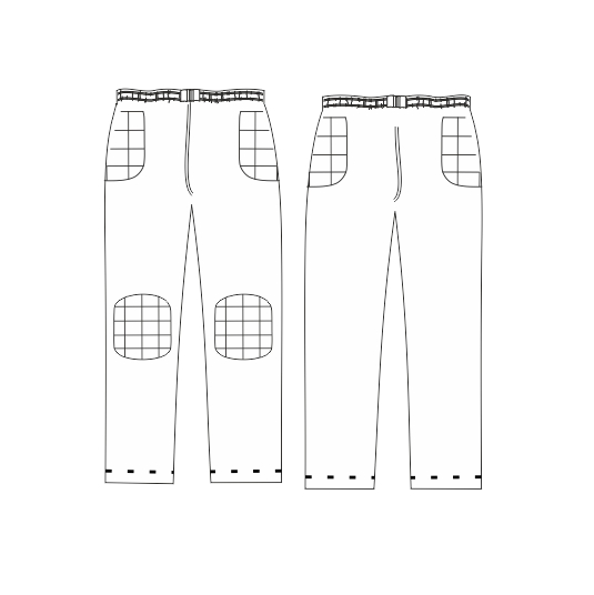 Брюки среднего объема, длинные. Пояс обработан широкой резинкой, имеется возможность регулировать ширину по талии за счет проложенного внутрь пояса шнура. Для защиты при падениях, на коленях и бедрах, имеются специальные защитные накладки из поролона.